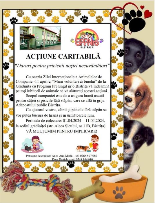 Activitatea principală a proiectului se va desfăşura în perioada 08.04-12.04.2024, fiind legată de Ziua Internaţională a Animalelor de Companie (11 aprilie) şi constă în sprijinirea Adăpostului pentru câini din Bistriţa, prin implicarea preşcolarilor care vor dona hrană pentru căţei (conserve, boabe). Diseminarea acestei acţiuni se va realiza prin crearea unui afiş, dar şi prin postări pe pagina de Facebook a grădiniţei, pentru a afla toţi cei care iubesc animalele şi care doresc să se implice. La intrarea în grădiniţă va fi amenajat un spaţiu pentru colectarea hranei destinată căţeilor.